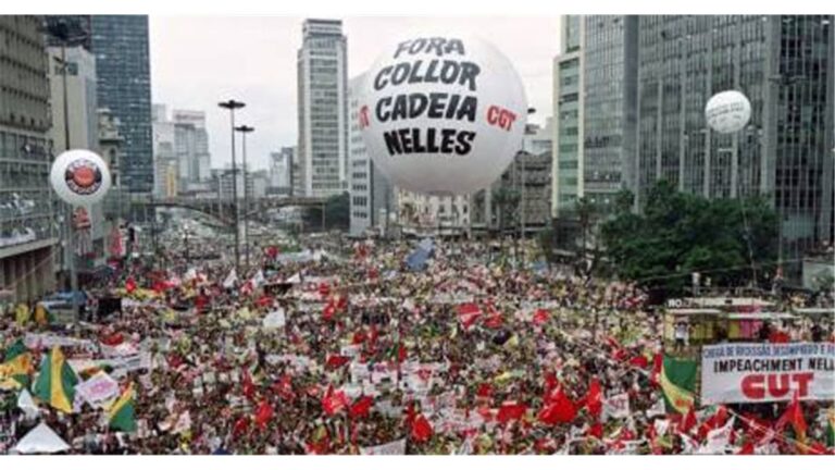 Cerca de 400.000 pessoas se reúnem no centro de São Paulo em 18 de setembro de 1992 para protestar e exigir a renúncia do presidente brasileiro Fernando Collor de Mello. – C´reditos: Antonio SCORZA / AFP) (Foto de ANTONIO SCORZA/AFP via Getty Images
