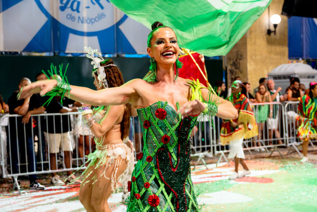 A Grande Rio, de Duque de Caxias, trouxe um dos momentos mais vibrantes da noite. Com uma equipe de musas deslumbrantes e a presença de sua rainha de bateria, Virginia Fonseca, a escola celebrou sua proposta para 2026: “A Nação do Mangue”, um enredo que prestará homenagem ao movimento Manguebeat e sua fusão de ritmos tradicionais com a cultura pop. A mistura de maracatu, coco e outros elementos da música popular brasileira com influências do rock e do hip hop promete uma apresentação arrojada e provocativa.